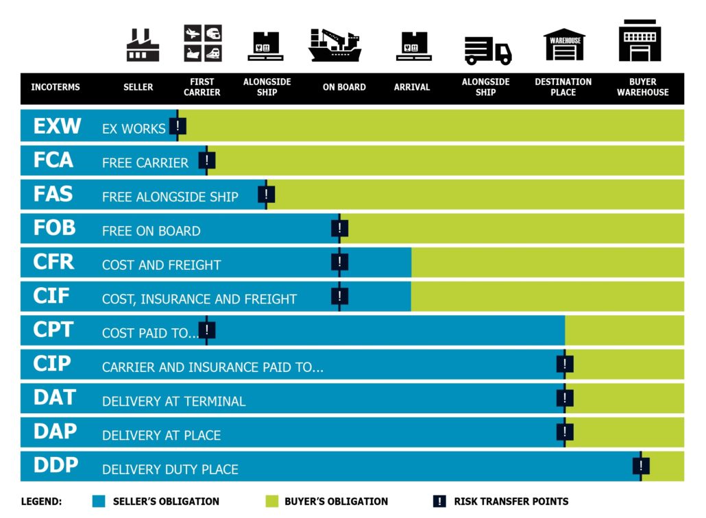 Incoterms are internationally accepted commercial terms defining the respective roles of the buyer and seller in the arrangement of transportation and other responsibilities and clarify when the ownership of the merchandise takes place. They are used in conjunction with a sales agreement or other method of transacting the sale.